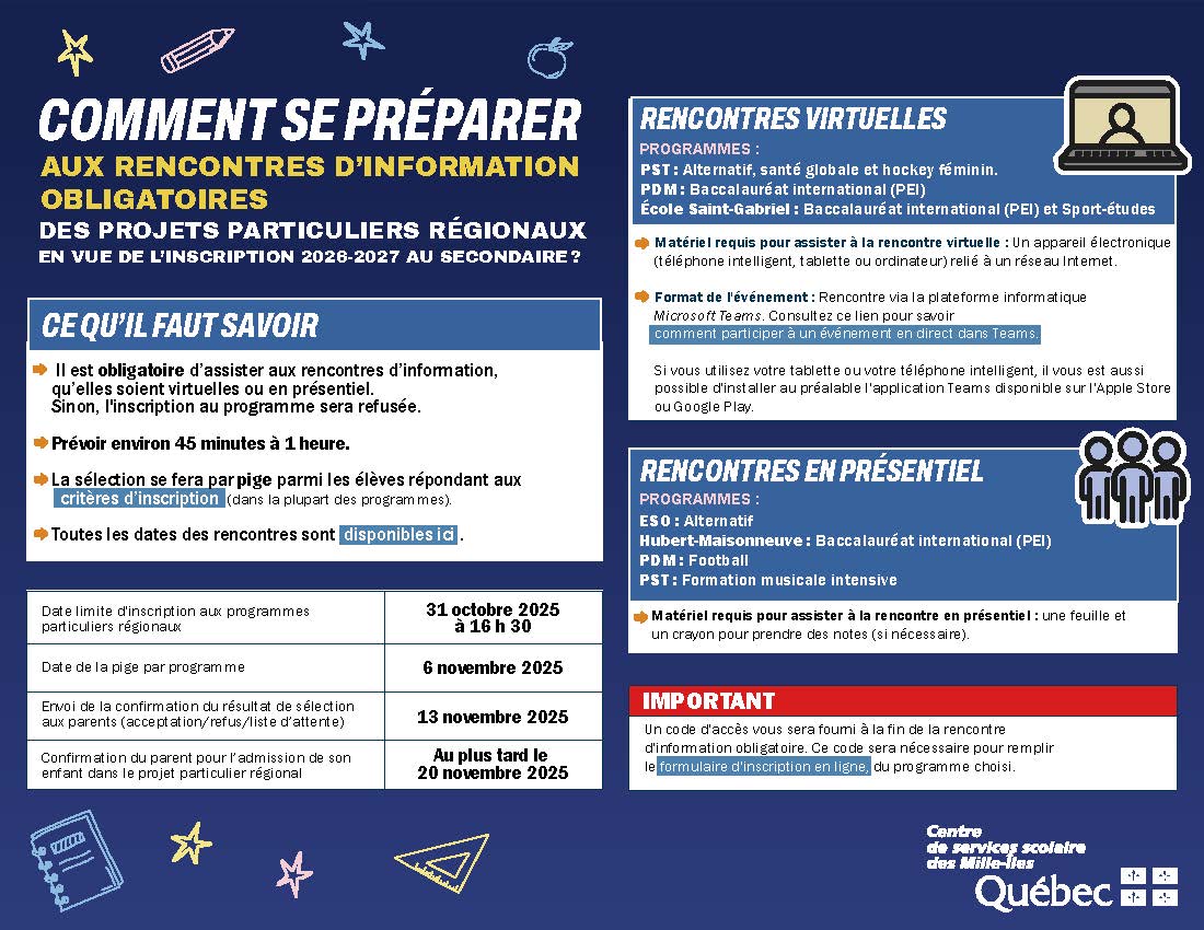 • Rencontres obligatoires pour les parents dans tous les projets particuliers régionaux.